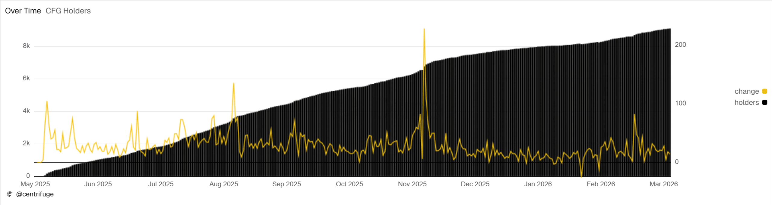 Dune Analytics 記錄了與 CFG 互動的總共 19,699 個獨特地址。此外,自 2025 年 5 月以來,持倉地址數量逐日穩定增長。
