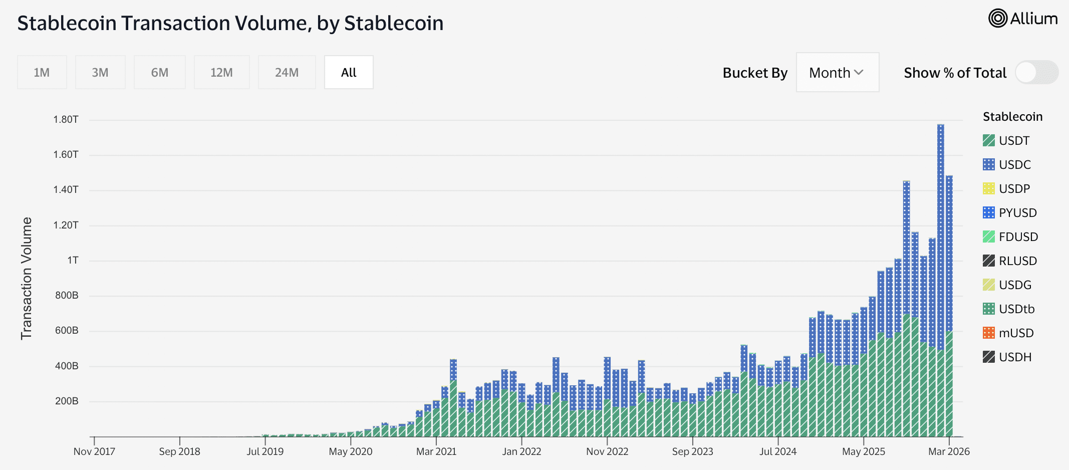 這還不是全部,數據還顯示,最近 USDC 的表現已超越 USDT。事實上,直到去年,大多數月份都是 USDT 主導交易量。然而,自 2026 年以來,情況似乎已發生變化。
