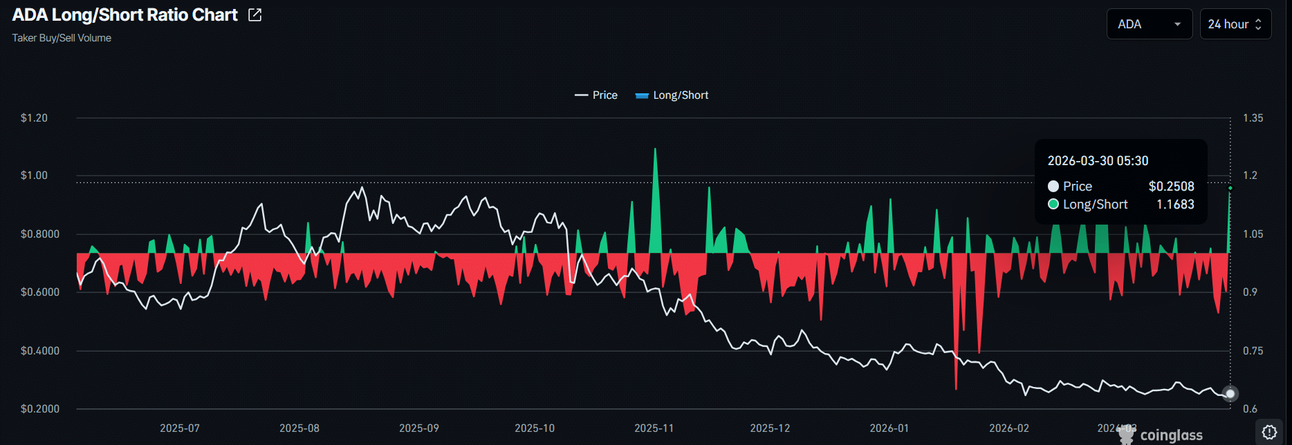 同時,CoinGlass 進一步顯示,ADA 的多空比已達到 1.16,為過去一個月的最高水平,表明交易者的看漲情緒強勢主導。