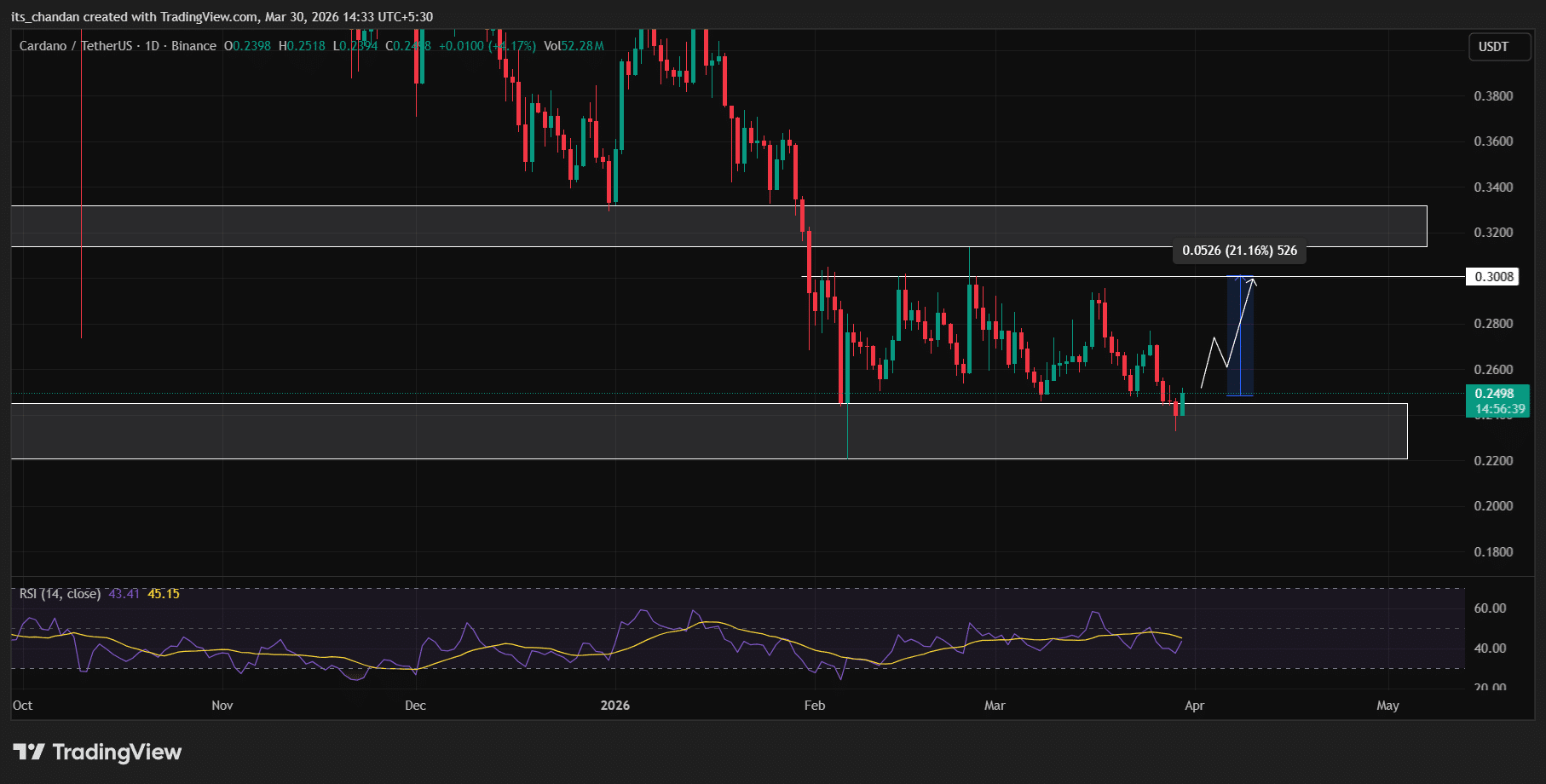 截至發稿時,ADA 在過去 24 小時內小幅上漲 2.55%,交易價格為 $0.2501。在此期間,該資產的最低價為 $0.235。