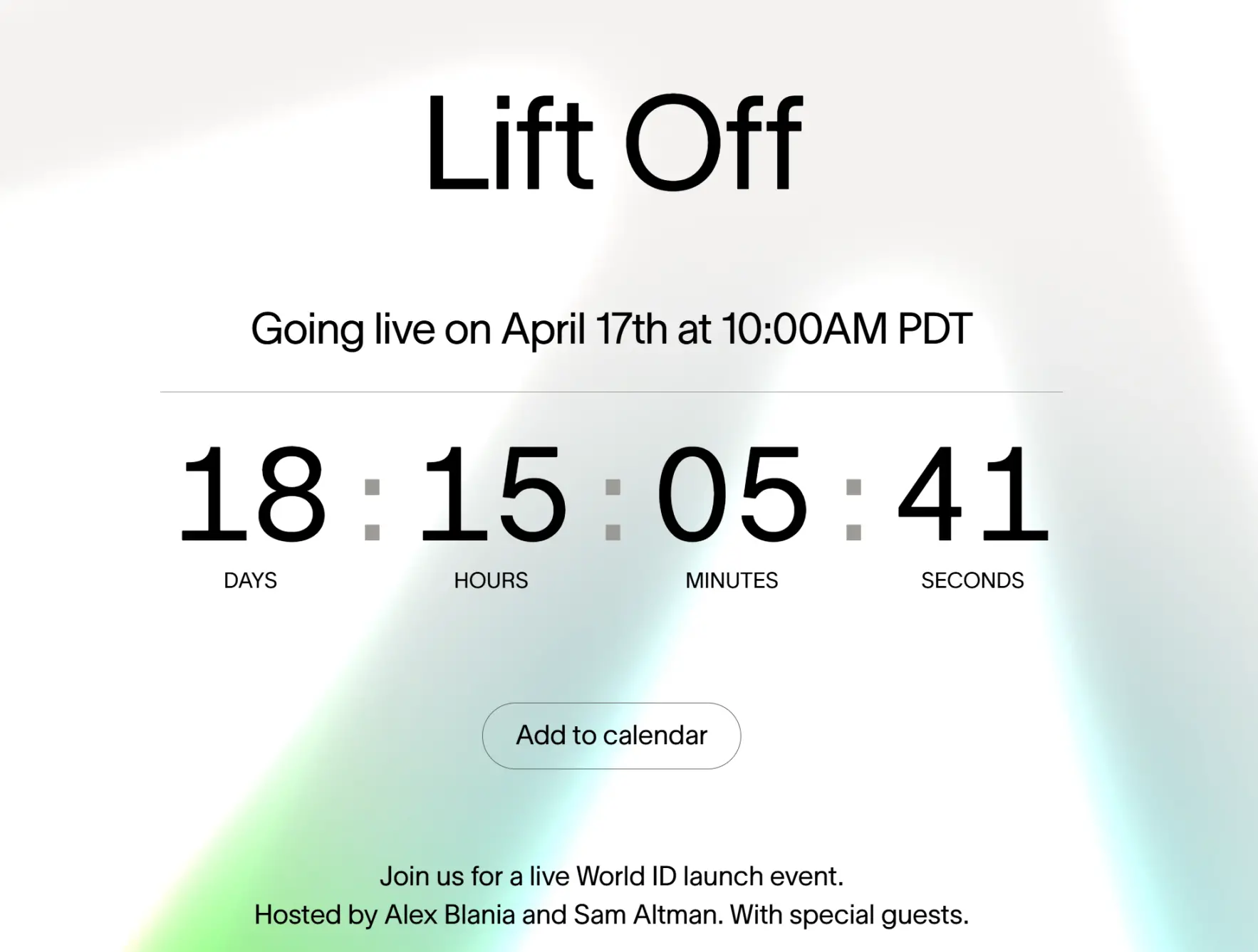 4 月 17 日,World 將在舊金山舉辦「Lift Off」World ID 全球發佈會,Sam Altman 將親自出席並與 world CEO Alex 共同主持。