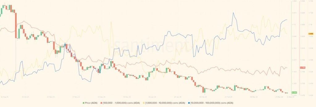 Cardano 的價格正面臨來自鏈上和衍生產品雙方面的累積看跌壓力。過去一個月,大額 Cardano 持有者(錢包餘額為 1000 萬至 1 億 ADA)持續增加其頭寸,但根據 Santiment 的 指標,該數字自二月以來未再變化。