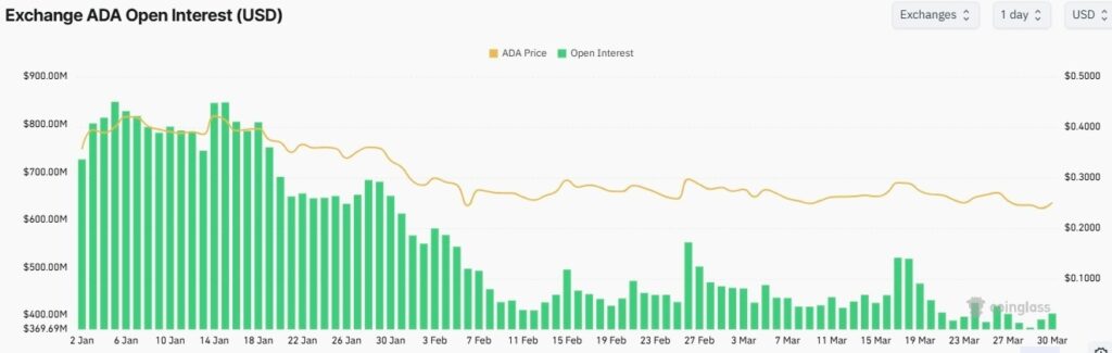 投資者對 ADA 的需求低迷,與其在所有交易所中交易者持有的未平倉合約總數(OI)下降同步發生。