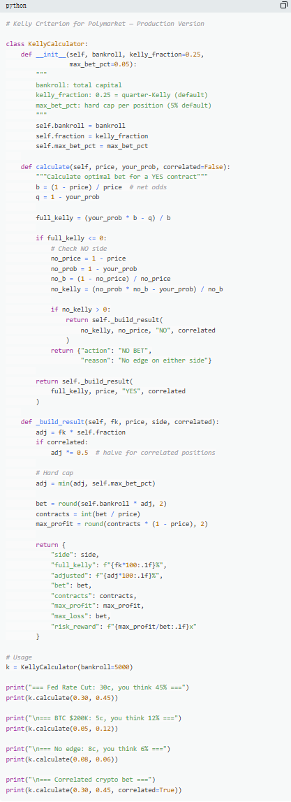 本質上,凱利公式提供了一套紀律:先判斷是否存在優勢(即主觀概率高於市場隱含概率),在此基礎上,再決定投入多少資金。只有當「是否下注」和「下注多少」同時被數學約束時,交易才真正從博弈走向策略。