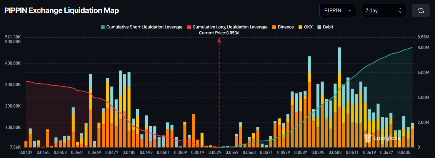 數據顯示,$0.0467 的下行和 $0.0605 的上行是交易者表現出強烈興趣的兩個關鍵水平,過去一週內累積了價值 $2.57 百萬的多頭持倉和 $4.69 百萬的空頭槓桿持倉。