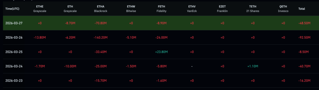 最大的單日資金外流發生在3月26日,當日有1.402億美元退出該基金。隨後在3月27日,又出現了7080萬美元的大幅資金外流。本周早些時候,ETHA於3月25日錄得3340萬美元虧損,3月24日為2500萬美元,3月23日為1570萬美元,凸顯出持續加速的資金撤離趨勢。