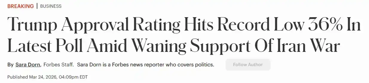 而本次開戰首日,特朗普的支持率卻低於 40%。連政治學中經典的「聚旗效應」——總統支持率因戰爭爆發而反彈——在本輪打擊中也未出現。截至 3 月 25 日,特朗普的整體支持率已跌至 36%,創下其第二任期新低。