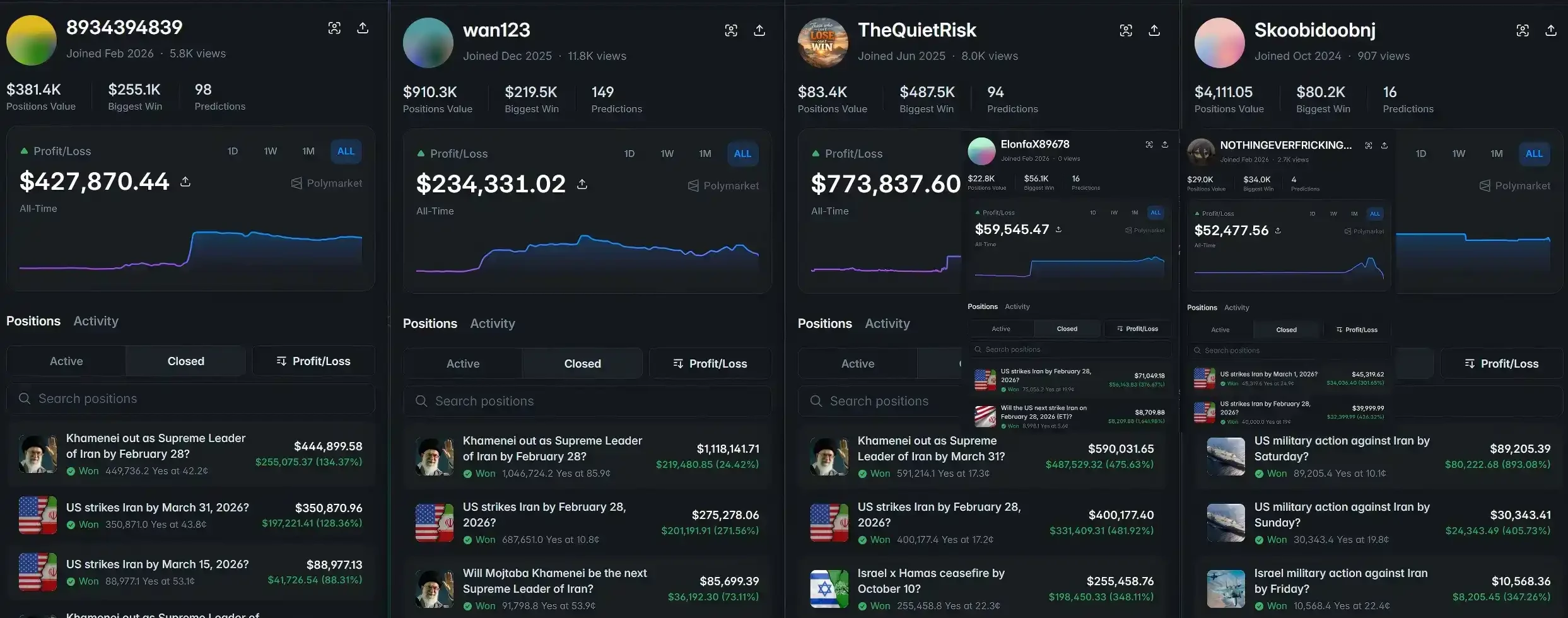 但在這些「賭徒」中,出現了 6 個極為可疑的賬戶。他們合計 180 萬美元的盈利,全部來自精準預測 2025 年期間的「美以打擊伊朗」和「以色列-哈馬斯停火」時間點,以及本次伊朗衝突的爆發時間和伊朗前最高領袖哈梅內伊的遇害。
