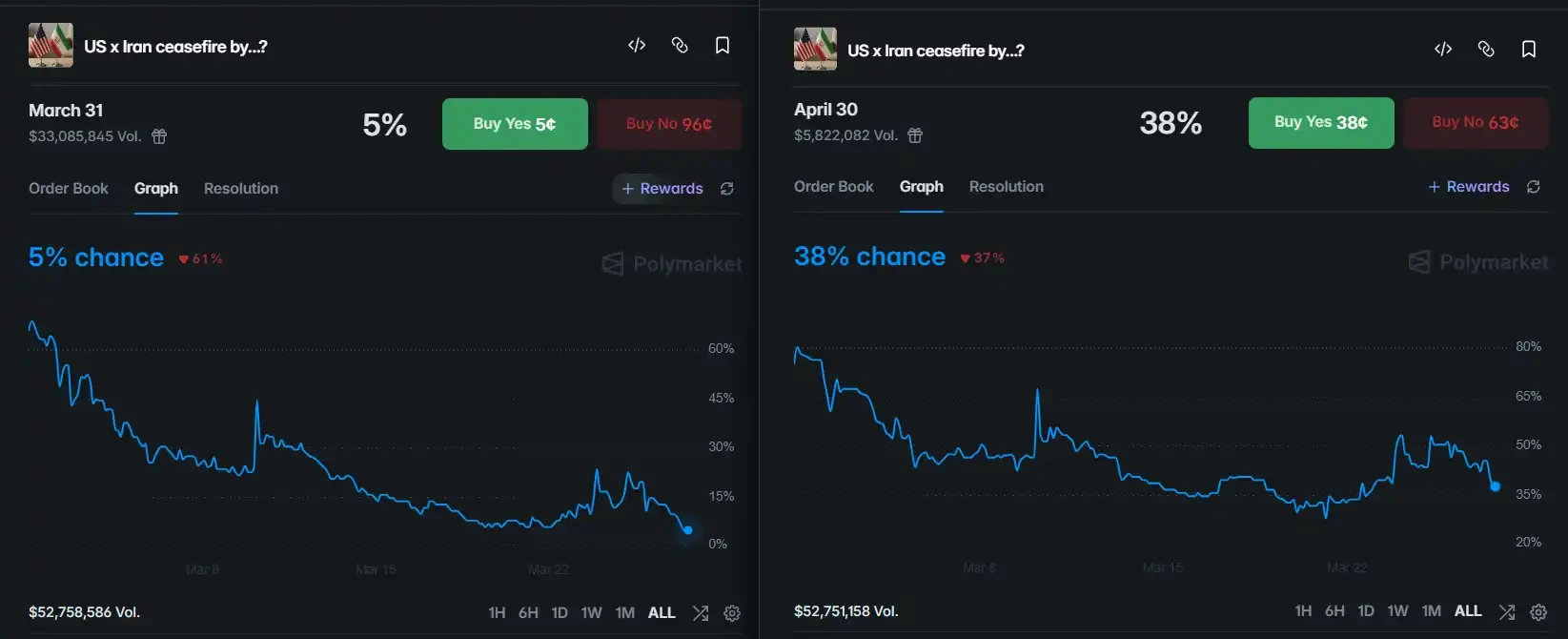 正如大眾所想,目前 4 月 30 日前停火的機率約為 38%,而 3 月 31 日前停火的機率僅為 5%。甚至不少人認為,這一機率應更低——那些「高估」停火機率的人,八成是連近期新聞頭條都沒看就來「碰運氣」的賭徒。