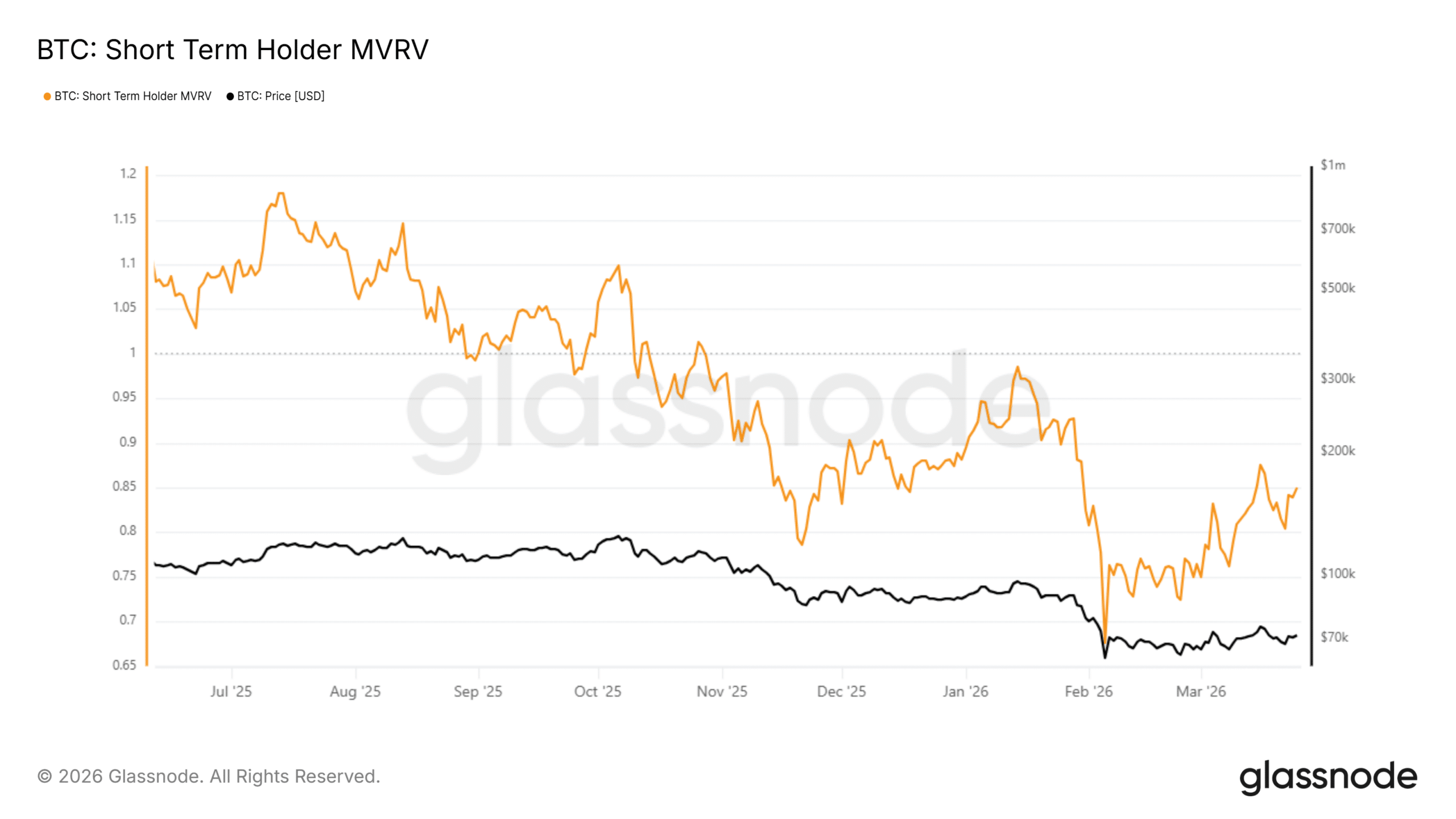 短期持有者頭寸目前定義了比特幣在當前區間內的上漲限制。當價格維持在支撐區附近時,STH-MVRV為 0.84,顯示近期買家仍約有 16% 處於虧損狀態。