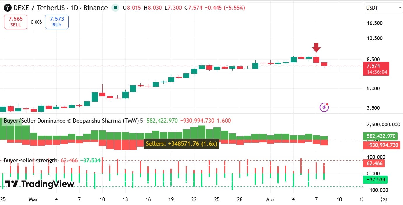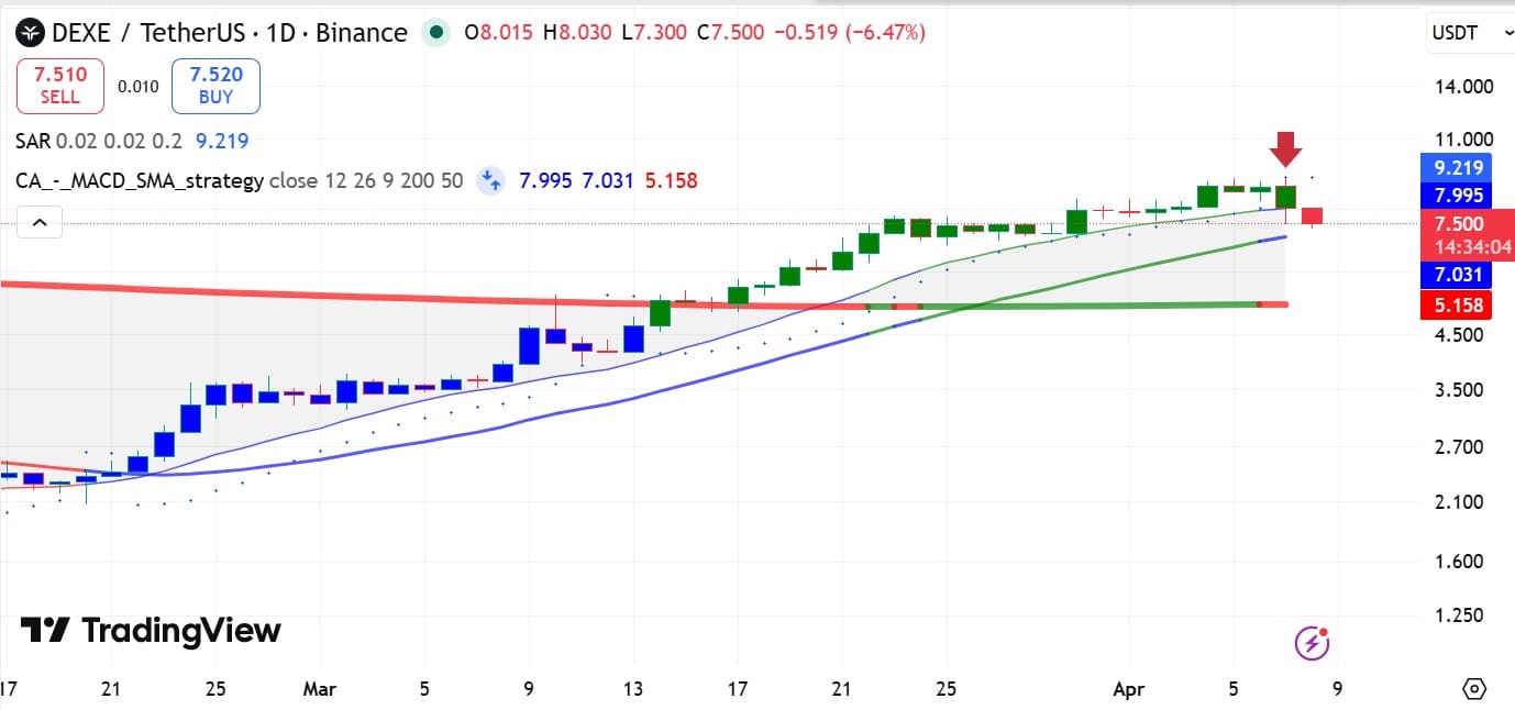 在失去 8 美元支撑位后,该山寨币从 9.2 美元跌至 7.3 美元。截至发稿时,Dexe [DEXE] 交易价格为 7.6 美元,日内下跌 15.27%。周跌幅接近 8%。