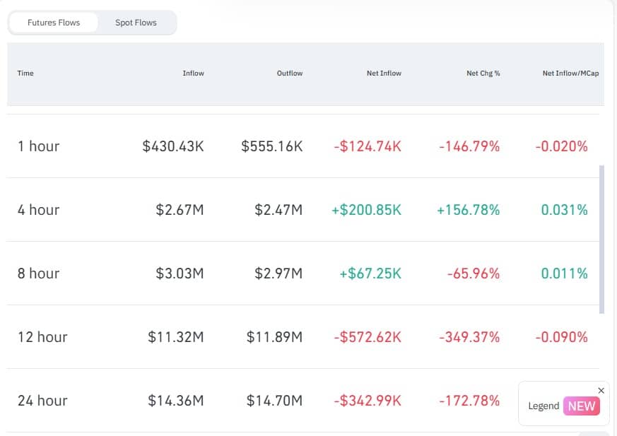 与此同时,期货资金流出增加,升至 1470 万美元,而流入资金则降至 1436 万美元。结果,期货净流量下降了 172% 至 -34.2 万美元,表明存在激进的抛售活动。