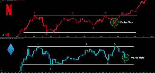 当前作为第六次互动的价格行为使以太坊处于区间下轨附近,这与Netflix最终突破前的阶段完全一致。