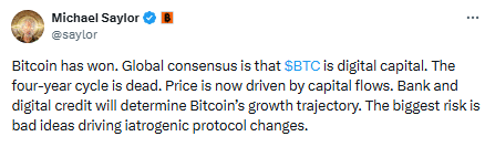 在此背景下,Michael Saylor的帖子开始显得更有道理,特别是他主张机构采用将推动比特币进入下一阶段。这自然引出了更重大的问题:Saylor的"比特币已胜出"论点会真正实现吗?