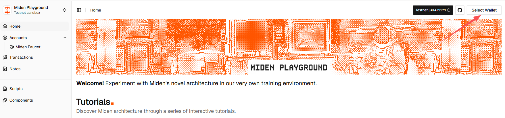 STEP 1. 进入官网(链接:https://playground.miden.xyz/),点击“Select Wallet”后按照要求安装钱包。