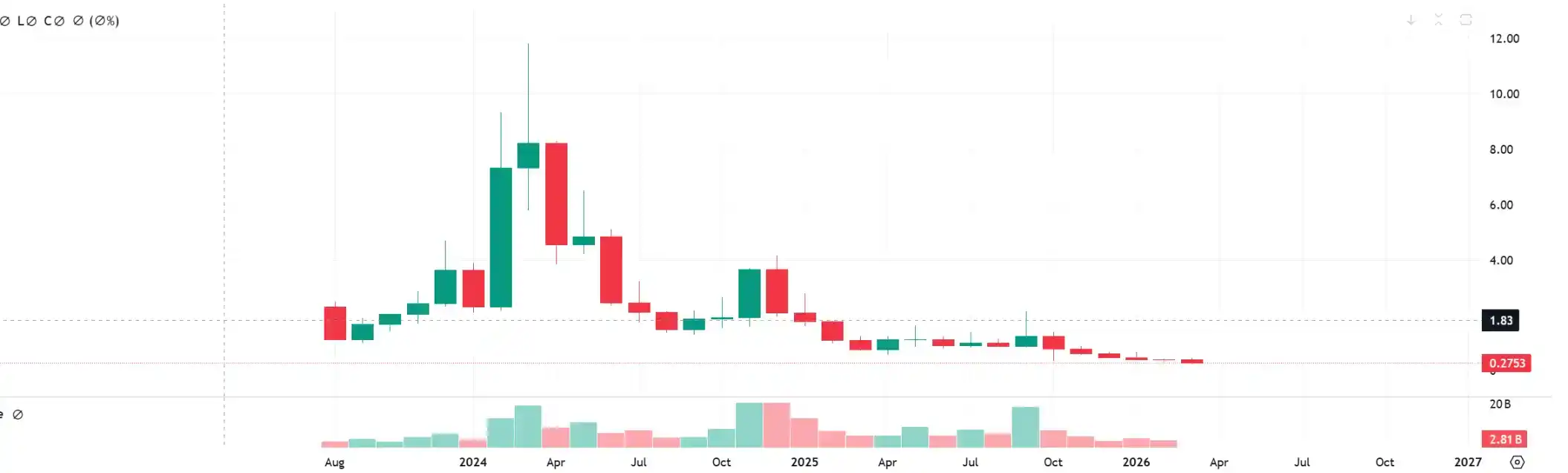 整个 2025 年,WLD 币价在 0.5-1.5 美元区间反复震荡,虹膜采用率增速虽稳步推进,但远未达到早期预期,用户增长与叙事热度出现明显脱节。进入 2026 年,WLD 继续探底,近期曾触及 0.2433 美元的新低,目前徘徊在 0.27 美元附近,较 ATH 累计跌幅超过 97%。