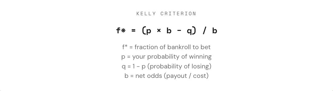 当发现一笔具备正期望值的交易时,真正的问题才刚刚开始,交易员该下多少?仓位过大,一次亏损就可能抹掉数周收益;仓位过小,即便有优势,增长速度也慢到几乎没有意义。在“全押”和“完全不下”之间,存在一个数学上最优的下注比例,这就是凯利公式。