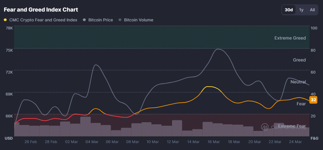 加密恐惧与贪婪指数显示,自比特币在3月中旬于7.5万美元附近遇到阻力后,该指数已滑回恐惧区域。