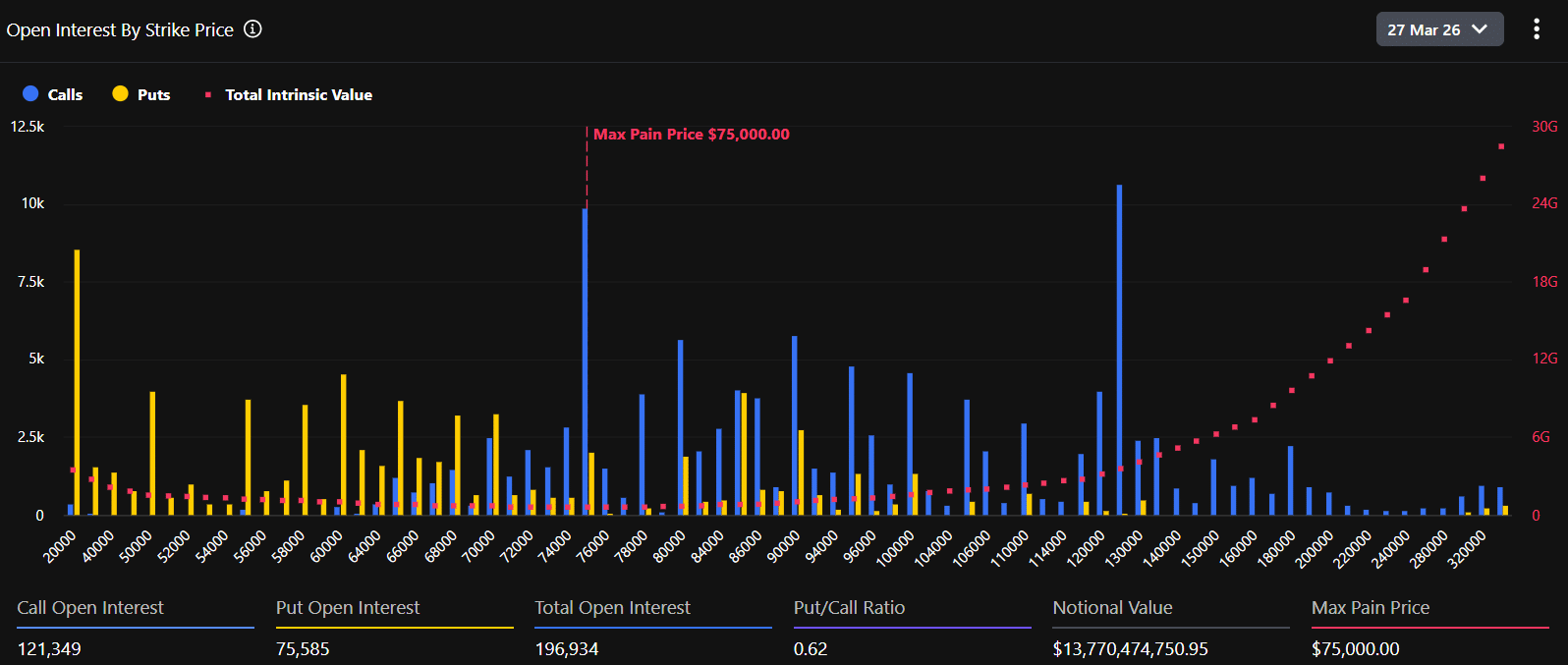根据Deribit数据,近140亿美元的比特币期权将于3月27日到期。实际上,这次到期占Deribit总未平仓头寸的近40%。