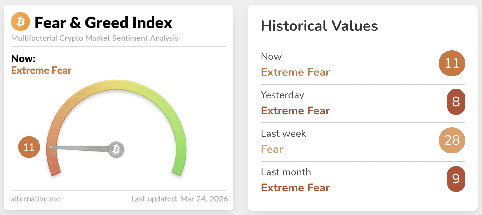 截至发稿时,过去24小时内加密货币总市值上涨约3.26%。但尽管出现上涨,投资者信心仍然非常低迷。