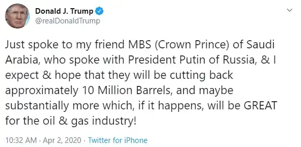 他把一屋子石油公司 CEO 请到白宫开会。然后亲自打电话给沙特王储穆罕默德·本·萨勒曼和俄罗斯总统普京,说服他们跟 OPEC 一起大规模减产。目的只有一个: