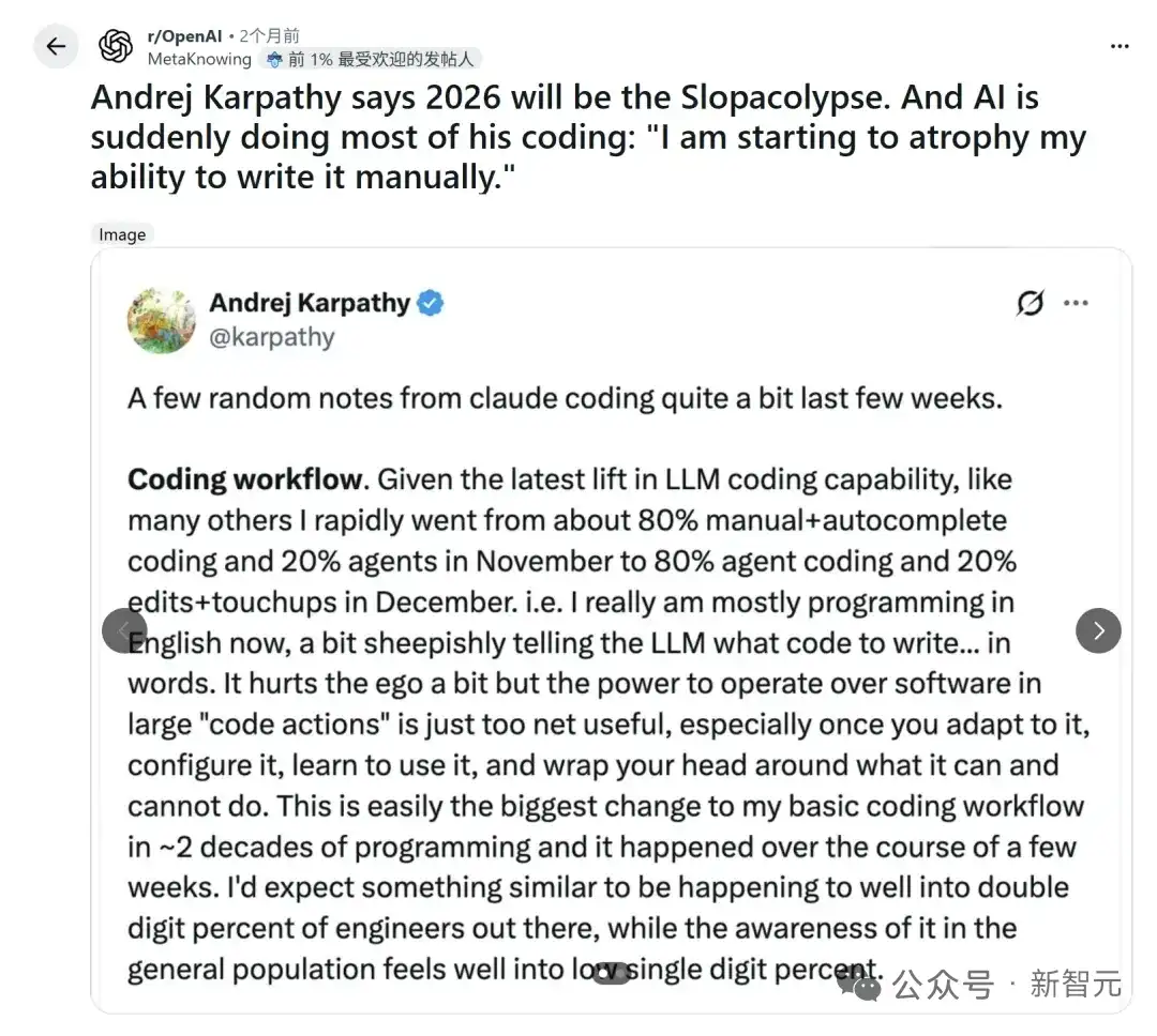 这位前OpenAI联合创始人、前特斯拉AI总监,从去年12月起就没亲手敲过一行代码。