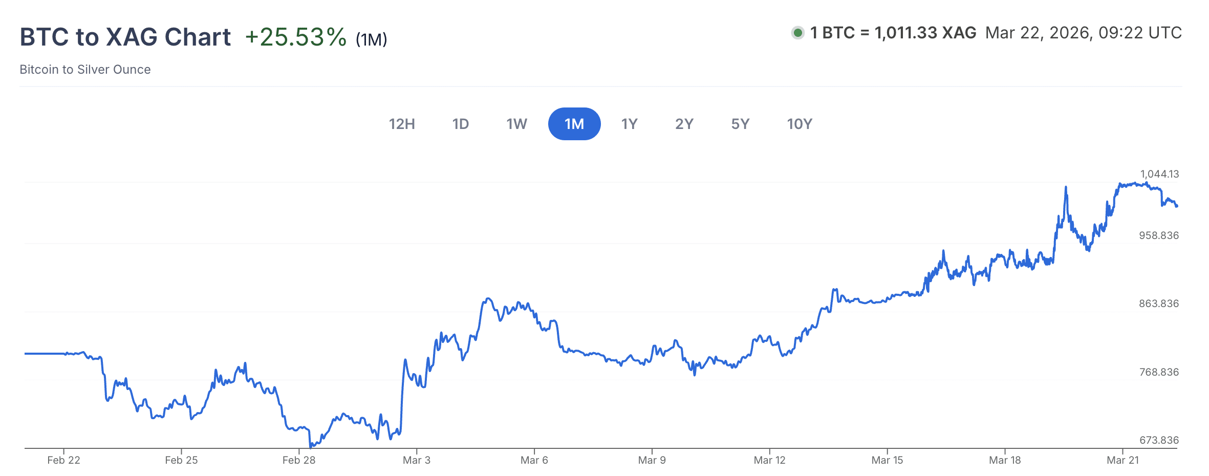 事实上,在过去一个月里,比特币明显跑赢白银,该比率上升了25%以上。简而言之,现在一个比特币可以购买超过1000盎司的白银,而几周前只能购买约700-800盎司。