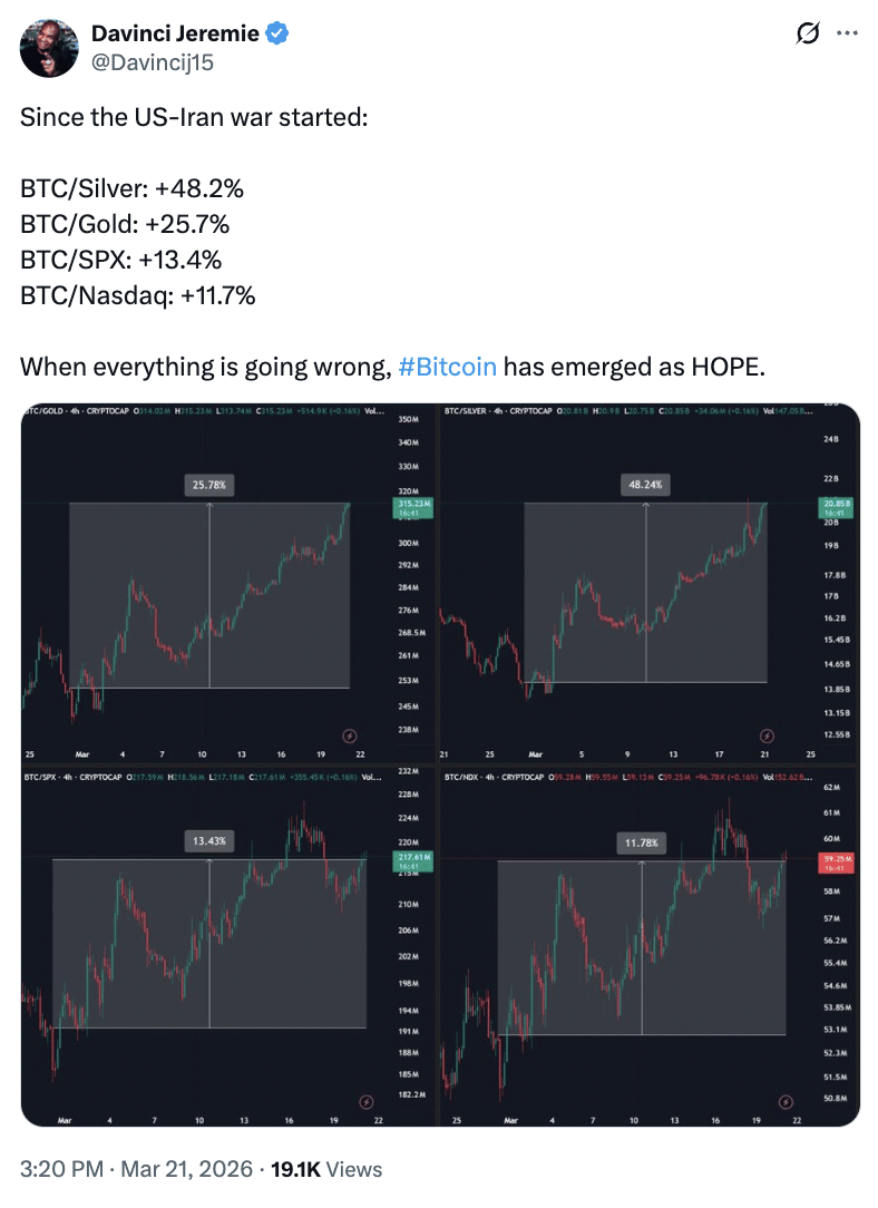 此外,即使在战争时期,比特币也表现出了韧性,比许多传统资产表现更好。