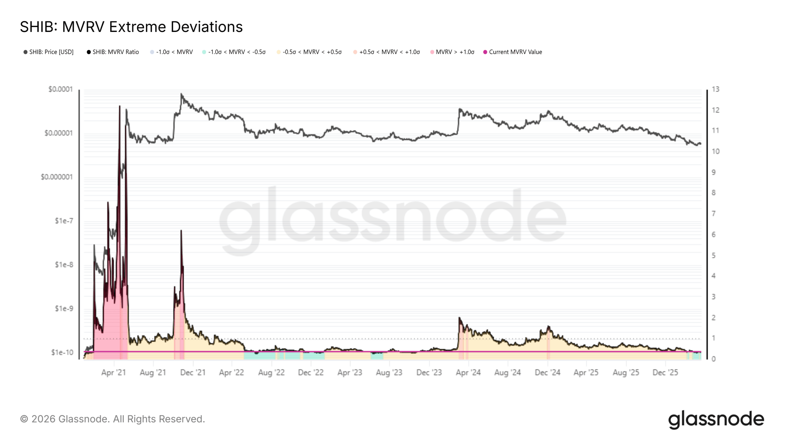 MVRV比率及其与历史均值的偏离度也可用于判断SHIB价格的极端情况。在2022年熊市期间,MVRV曾处于均值下方0.5至1个标准差之间。