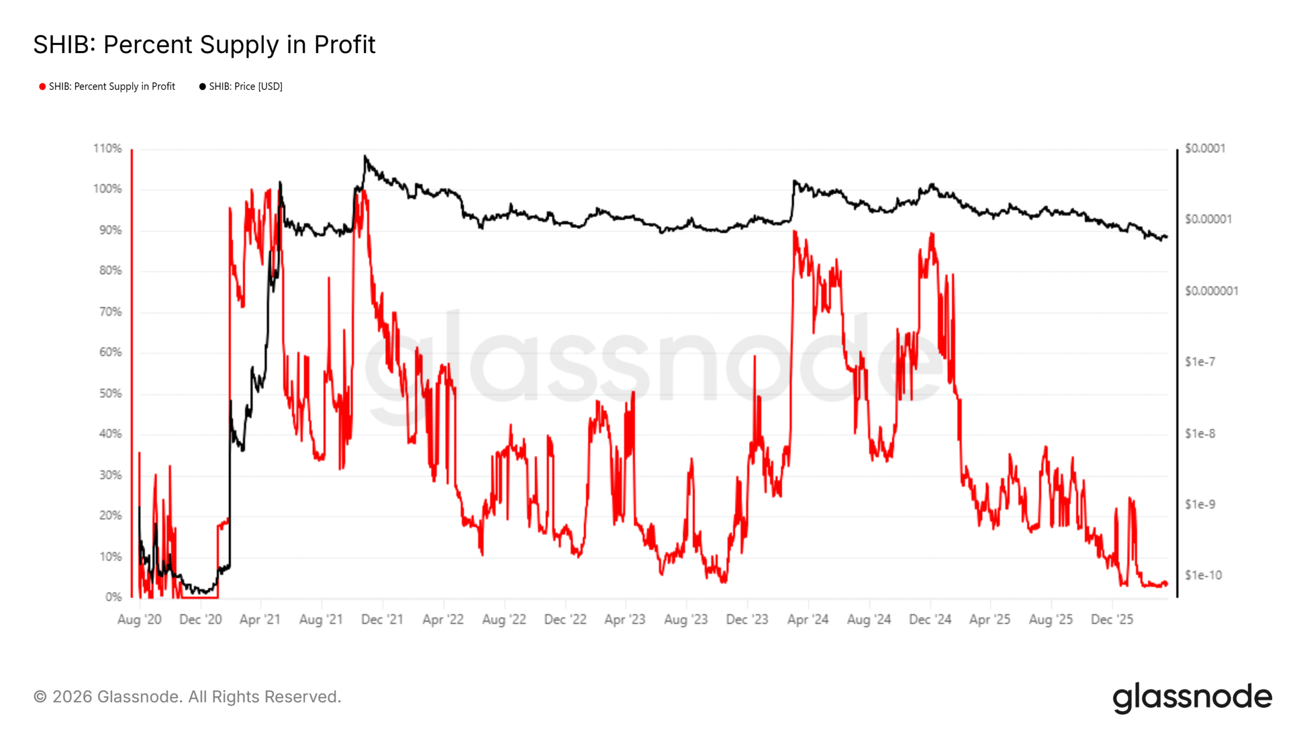 2026年2月该指标曾跌至2.86%。近期流通供应量一直处于熊市盈利水平。持有者深度亏损意味着市场对这款迷因币的情绪极度悲观。