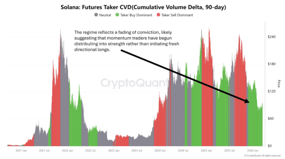 然而到2026年,买盘压力消退而卖盘集群重现——这表明动量交易者可能正在分散持仓而非投入新资金。这或是周期末段疲软的迹象,此时杠杆信心通常会下降。