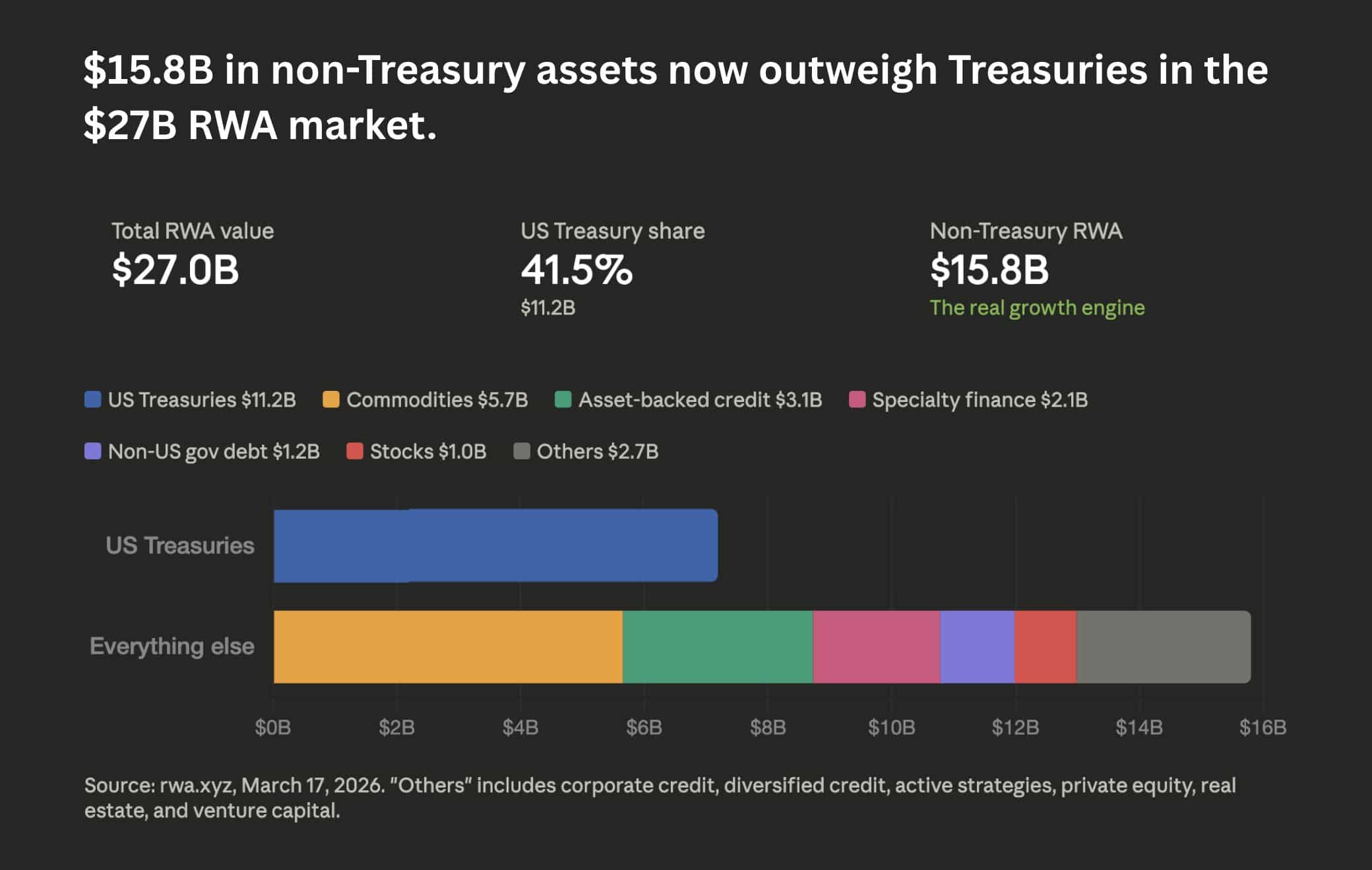 数据充分证明了这一点:RWA总市值已突破270亿美元,其中非国债资产达158亿美元,超越美国国债成为主要增长动力。这包括大宗商品、资产支持信贷和专业金融等类别,而代币化股票规模也已达到10亿美元里程碑。