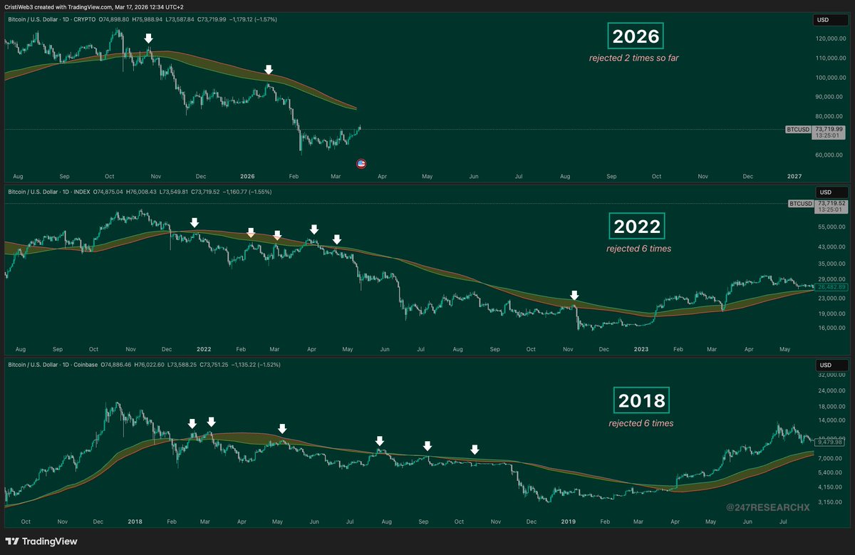 历史周期恰好印证了这一点:在2018年和2022年,比特币多次未能重新站稳该支撑带,随后继续下探。