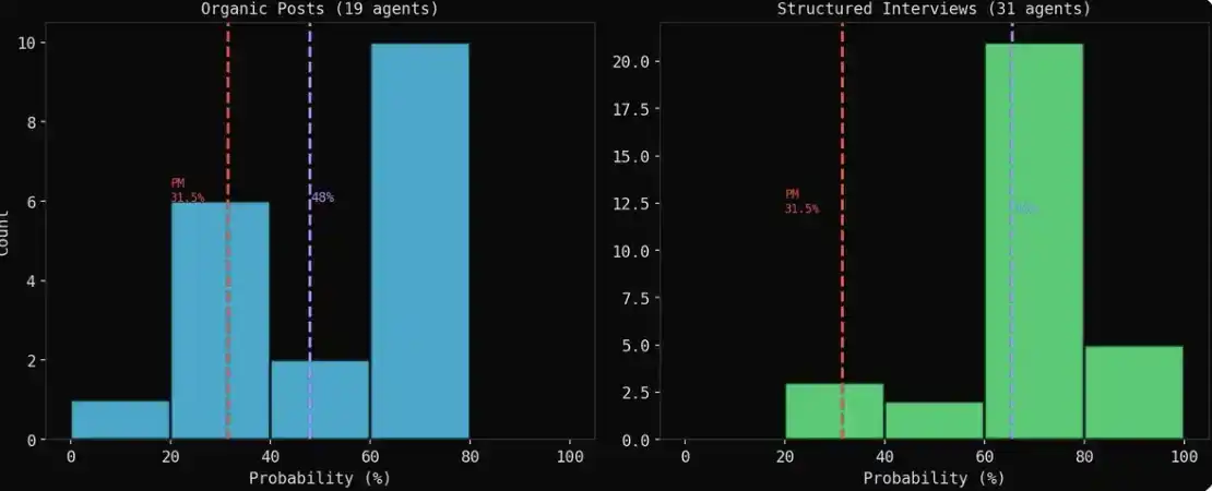 访谈结果会显得更加乐观。当代理自由发帖时,空头(悲观者)的观点往往更响亮、更具体;但当你对他们进行一对一采访时,出于合作偏好,几乎所有人都会给出 60%–70% 的判断。