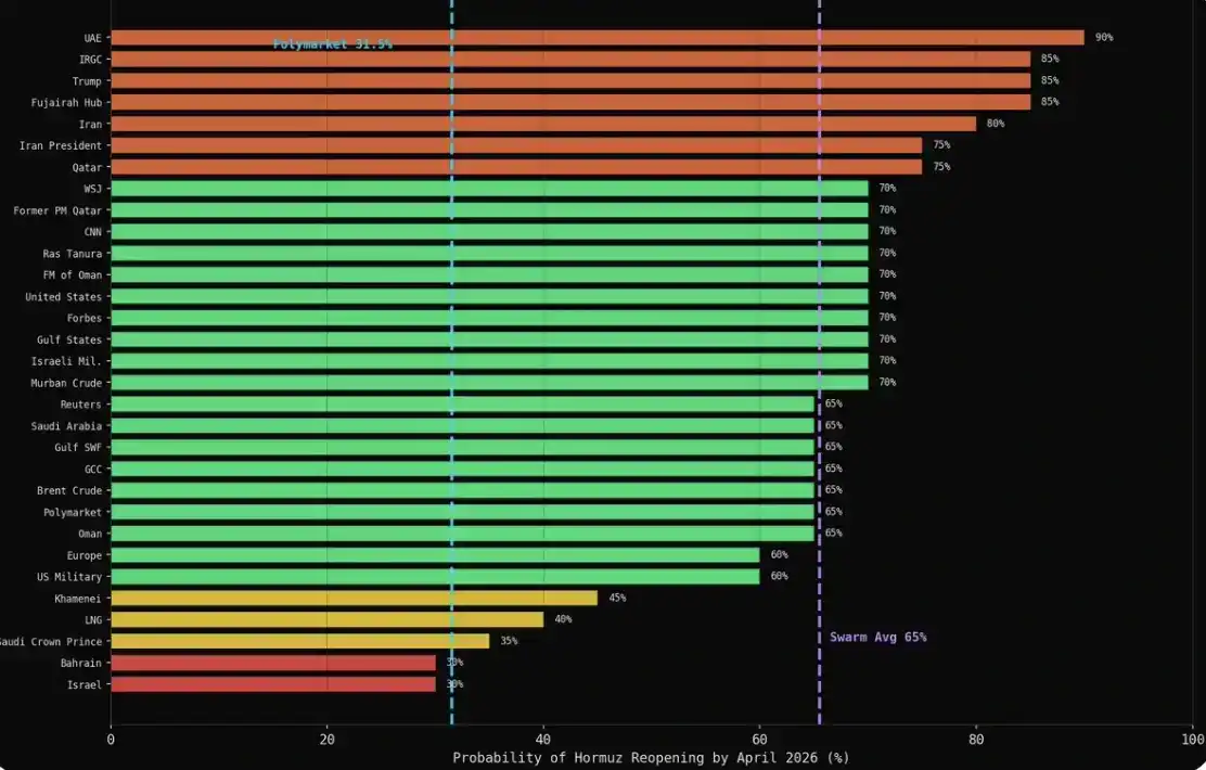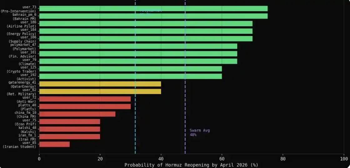 模拟结束后,我使用 MiroFish 的采访功能,向 43 个核心代理提出同一个问题:你认为到 2026 年 4 月底,霍尔木兹海峡的海上运输恢复正常的概率是多少(0–100%)?