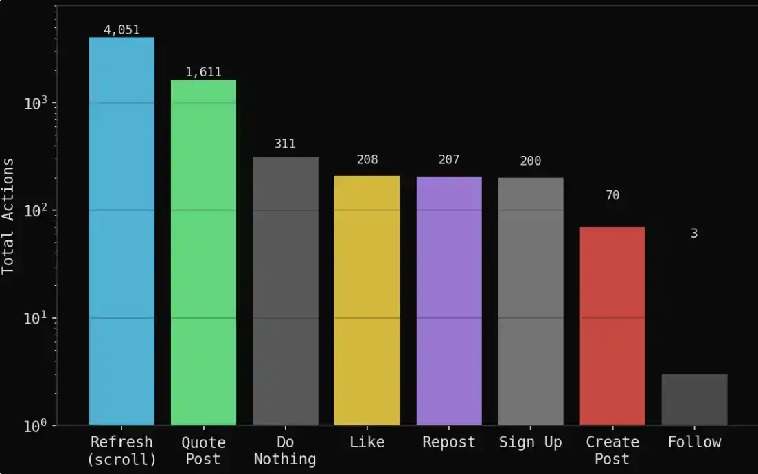 在整个过程中,代理会自主运行:它们会观察时间线,决定自己是发帖、转推评论、转发、点赞,还是单纯刷一刷信息流,整个过程不需要人工干预。