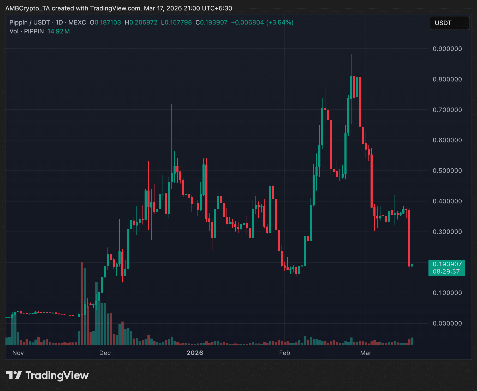 价格图表显示,在加速下跌之前结构已明显失效。在未能守住0.30美元整理位后,PIPPIN以强劲动能向下突破,同时交易量明显激增。