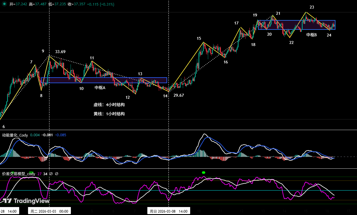 • 平仓决策:依据价差量化模型与动能量化模型发出顶部共振信号,且价格已接近I浪顶点 38.41 美元附近,所以于 37.19 美元附近清仓。