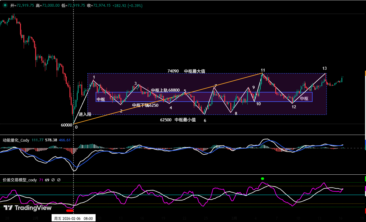 • 中枢构筑:在(图六)中显示:上周主要运行 12-13 段走势结构。目前看,上涨中枢构筑过程中。其最高阻力位上移至 74,090 美元附近,最低支撑位约 62,500 美元附近;中枢上轨约 68,800 美元,中枢下轨约 66,250 美元。