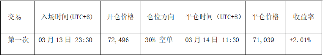• 开仓:币价反弹至 74,500 美元附近遇阻,同时价差交易模型触发强烈顶部预警信号(图中绿点),且两大模型沽空共振信号,所以我们于 72,496 美元建立短线30%空头仓位。