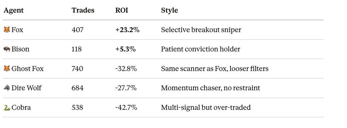 那些试图通过“安全”交易维持高胜率的 Agent 反而全部亏损 —— 因为设定微小盈利目标的每笔交易,仍需承担手续费和市场风险。