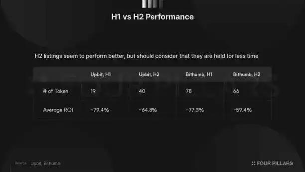 值得注意的是,上下半年表现的差距幅度颇为显著。在 Bithumb,上半年上线代币(-77.3%)与下半年上线代币(-59.4%)的收益率相差约 18 个百分点,这一差异难以仅用时间因素解释。可能性包括:下半年上线的代币确实具备更强的基本面支撑,或是市场预期已因上半年的教训而趋于理性。