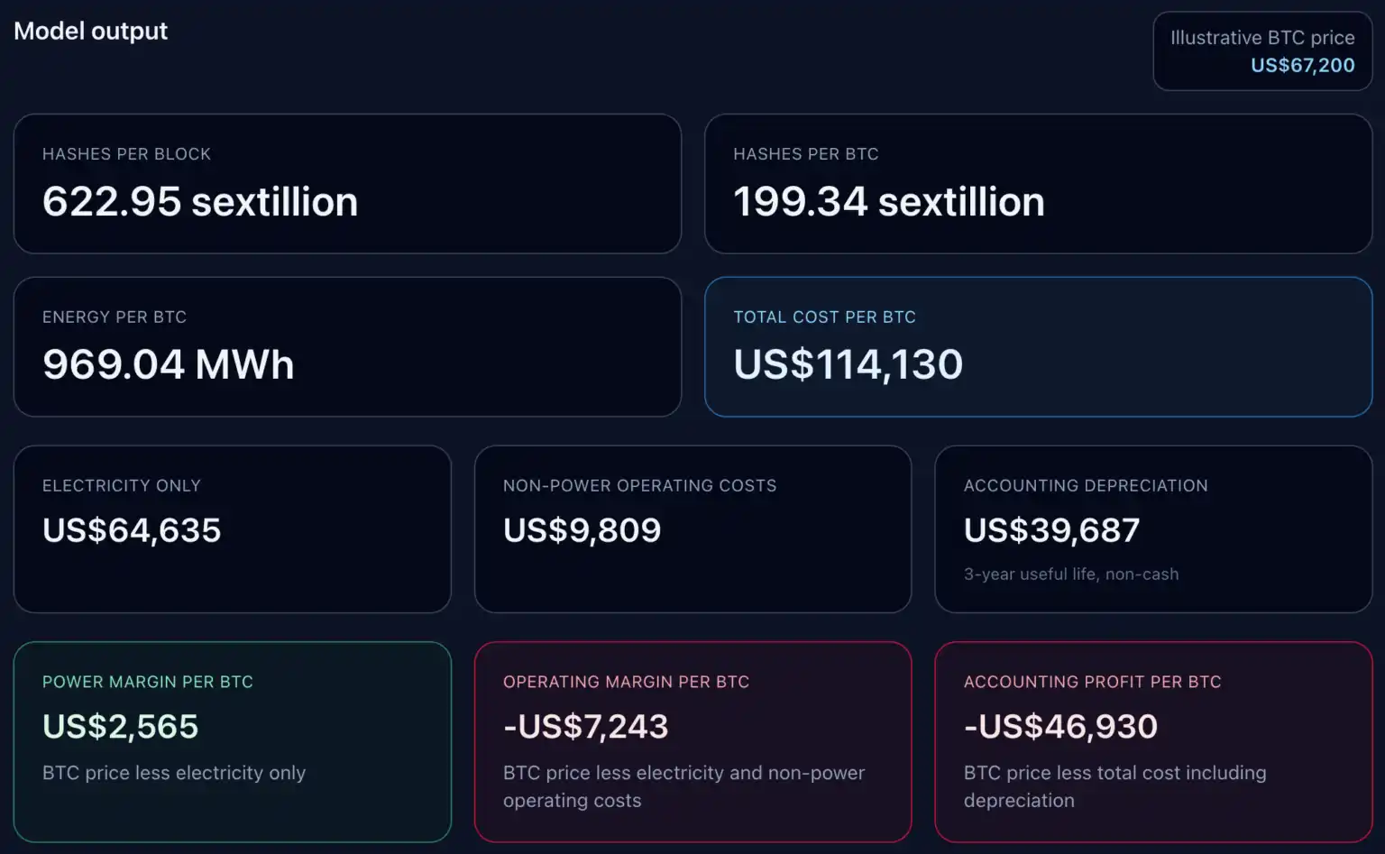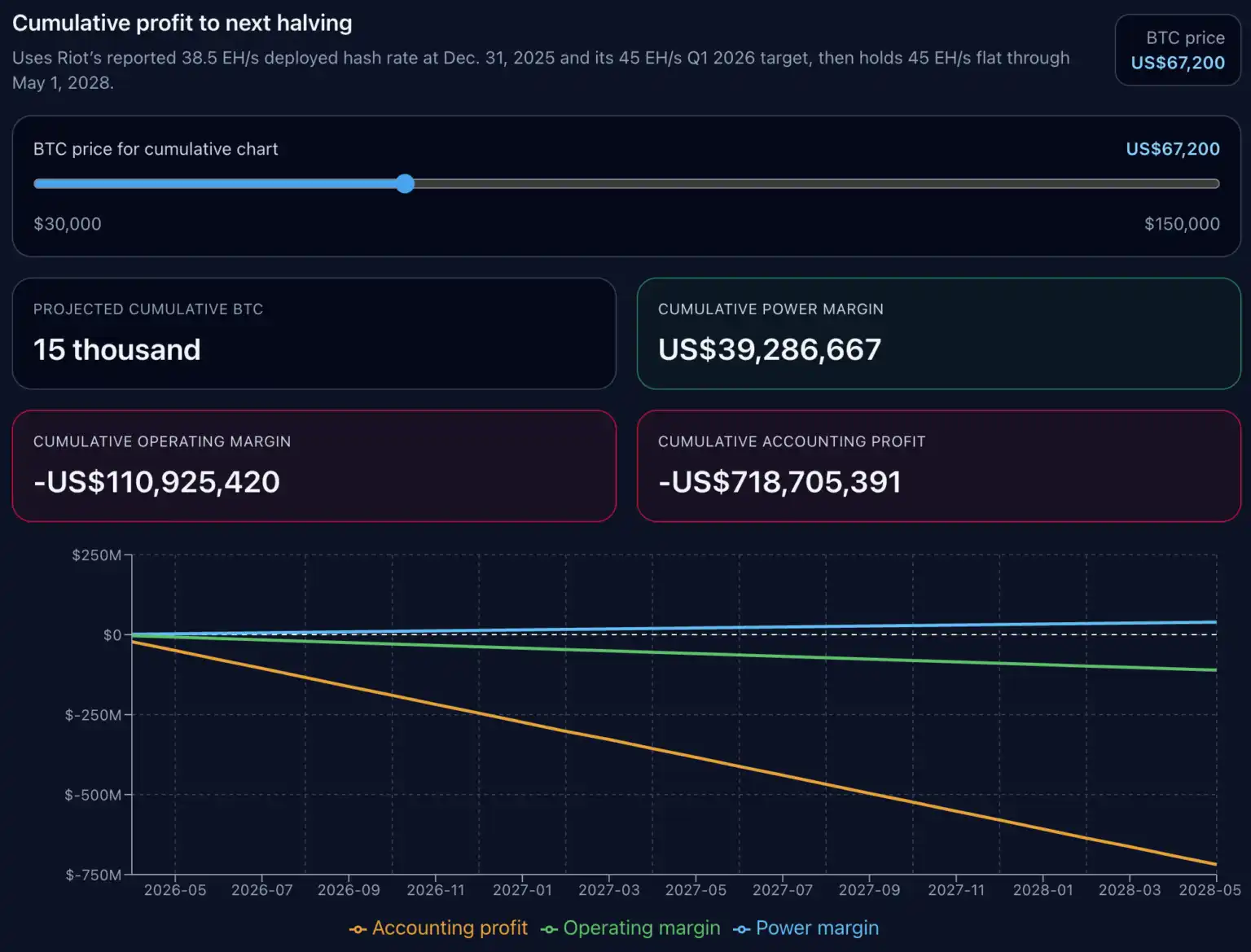 $67,200 当前价格情景下,Riot 刚刚跨越电力盈亏平衡点,仅略高于临界值。电力利润转正,但运营和会计视角仍为负值。