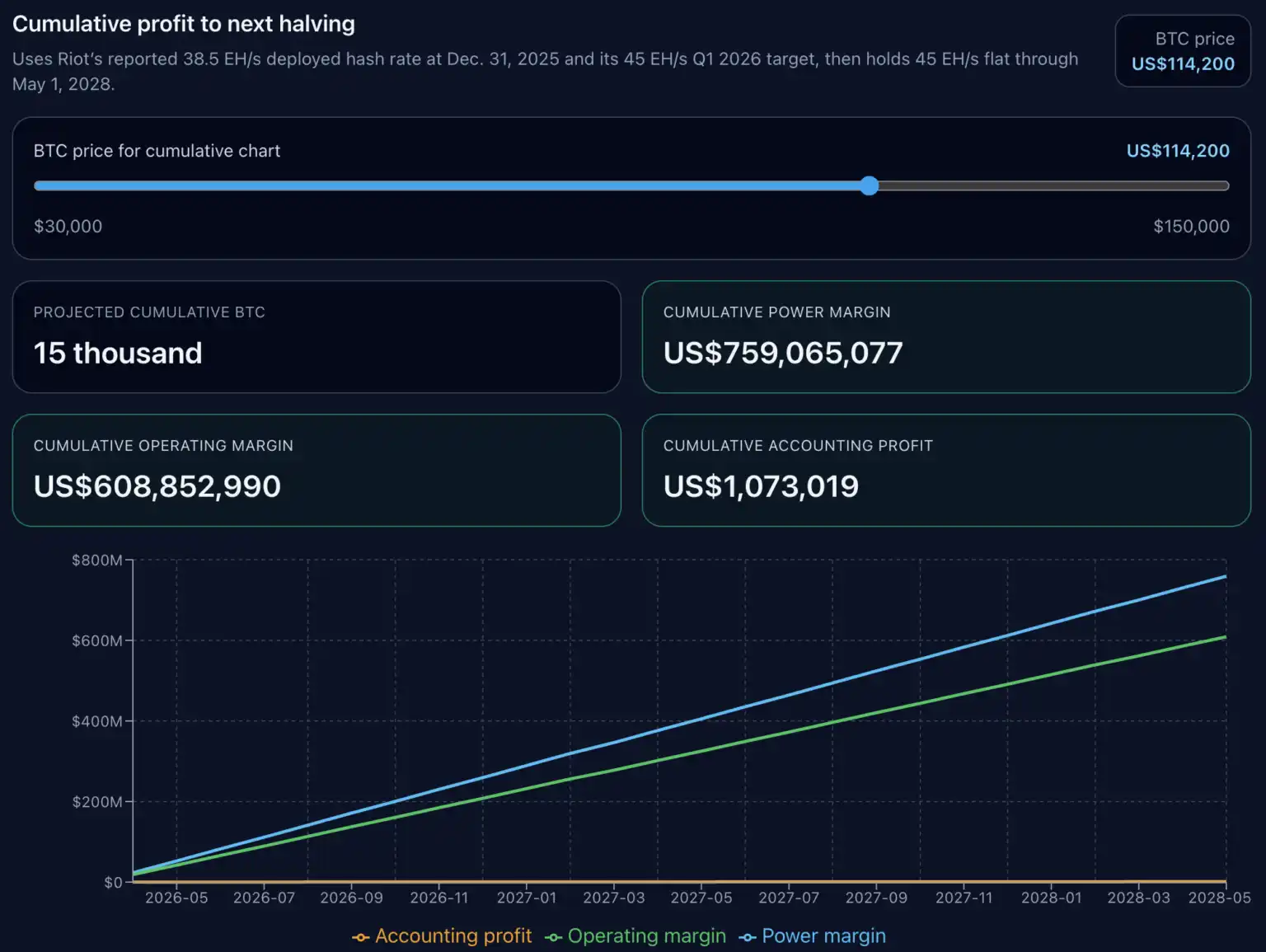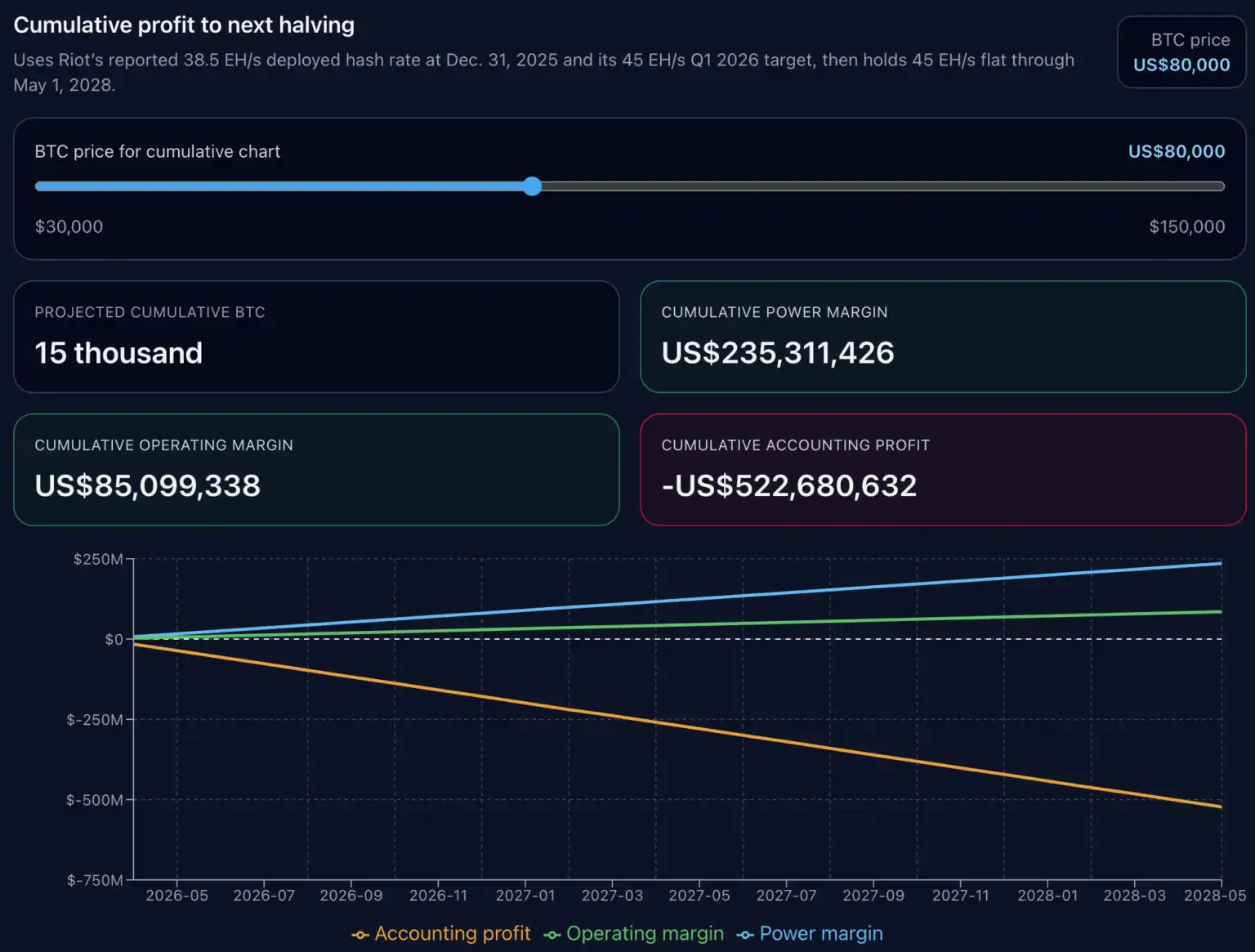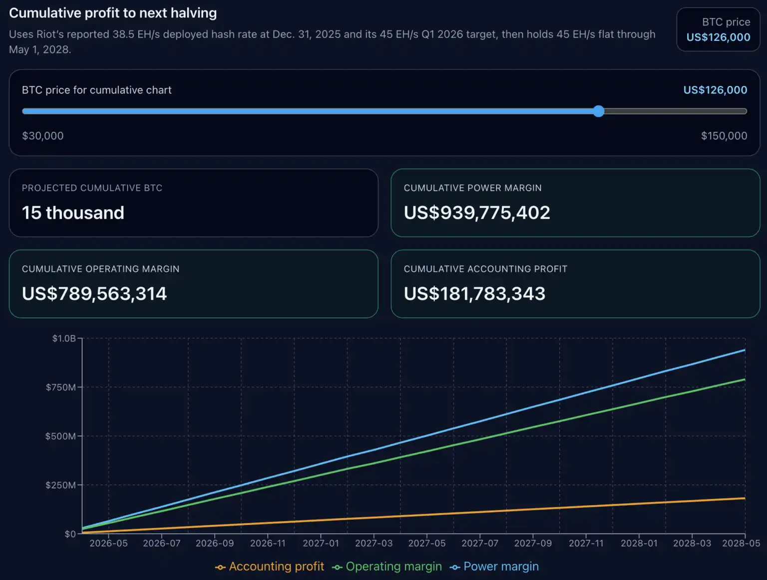 我们的累计图表未对未来的难度、手续费、停机、调峰收入、融资或新资本支出作出预测,仅假设当前每 BTC 经济性不变,并按 Riot 计划的算力路径进行推演。