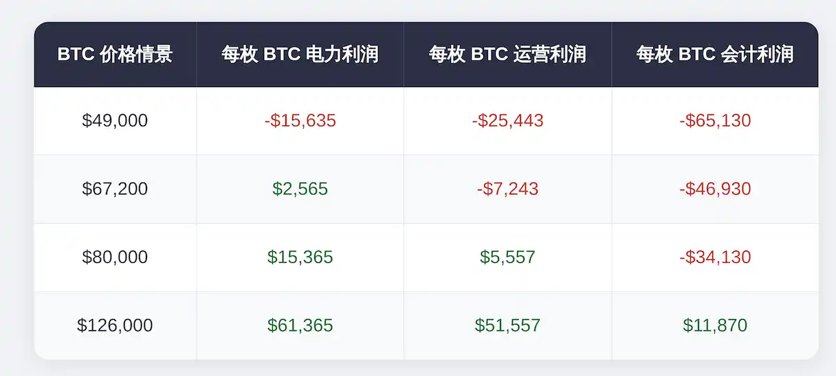 三个层面同时转正,需要 BTC 重回历史高点$126,000,届时会计利润为$11,870/BTC。