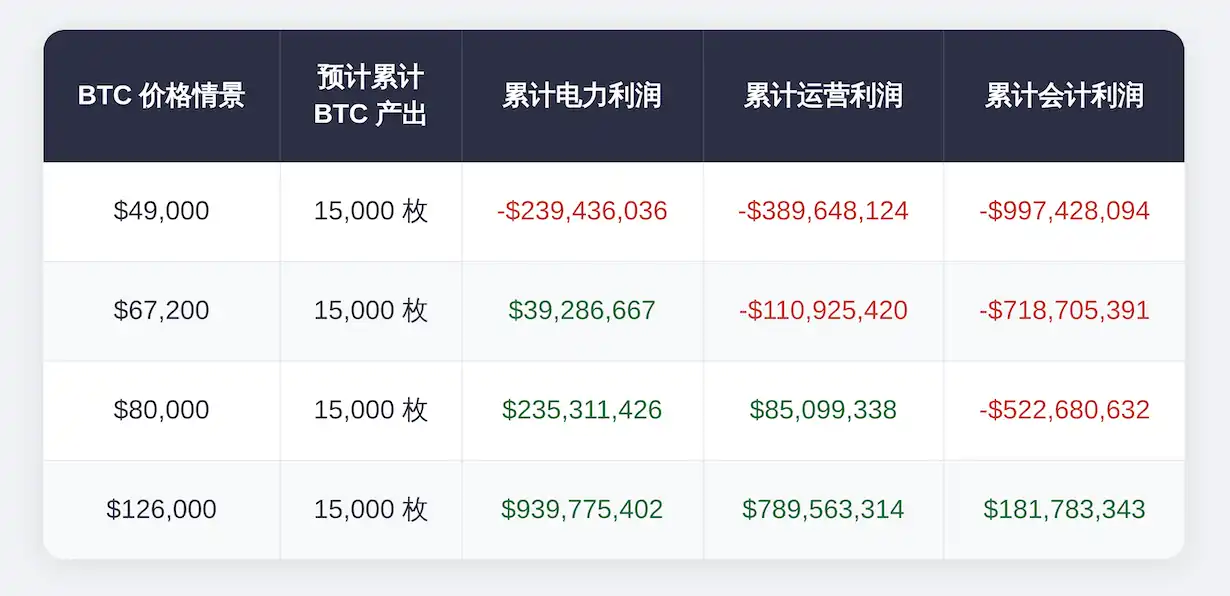 在所有四种情景下,预计累计挖矿 BTC 总量均为 1.5 万枚,变化的是利润结构。