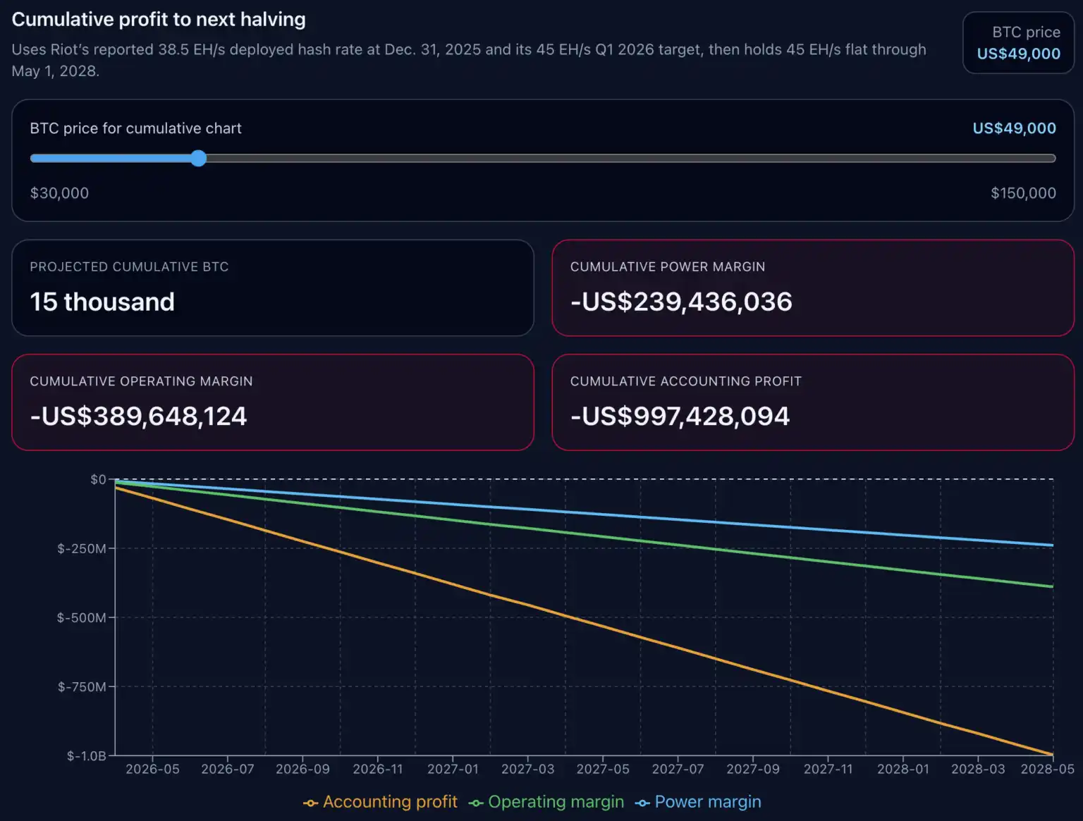 $49,000 情景下,Riot 累计电力利润-$239,436,036,累计运营利润-$389,648,124,累计会计利润-$997,428,094。