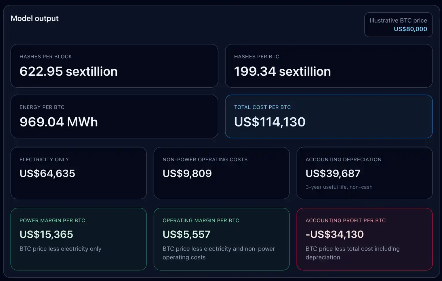 上述参数产生以下结果:每块网络总算力 622.95 六亿亿次哈希,每 BTC 所需算力 199.34 六亿亿次哈希,每 BTC 能耗 969.04 兆瓦时。