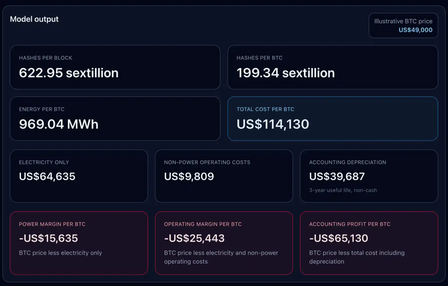 加入 Riot 财务文件中约$9,809/BTC 的非电力运营成本后,运营利润变为负$7,243,总成本相应上升。再加入约$39,687/BTC 的非现金折旧,会计利润跌至负$46,930。