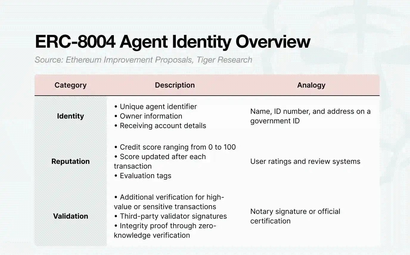 首先是身份层。AI Agent 在区块链上运行必须是可识别的。ERC-8004 充当了这一功能。它以 NFT 的形式发行,但不是艺术收藏品,而是包含结构化身份数据的凭证 NFT。每个 Token 包含三个部分: